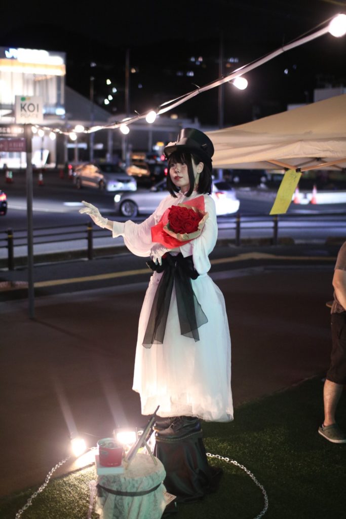 【アメノシズ】パントマイムアーティスト広島県福山市出身。広島市在住。2020年よりパフォーマーとして活動開始彫像やマネキン人形になりきるスタチューパフォーマンスでコロナ禍を乗り越え、大道芸を通して翌年には活動範囲を全国に広げる。リアルな日常の風景を表情豊かに誇張したパントマイム作品が特徴的。踊りや演劇の要素も深く、全国のショーイベントや劇団公演の客演としても活躍。単独舞台も精力的に行っている。アメノシズの名前は芸能を司る女神『アメノウズメノミコト』から由来する。