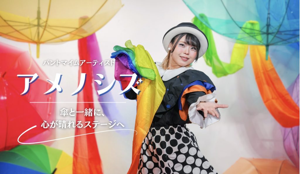 【アメノシズ】パントマイムアーティスト広島県福山市出身。広島市在住。2020年よりパフォーマーとして活動開始彫像やマネキン人形になりきるスタチューパフォーマンスでコロナ禍を乗り越え、大道芸を通して翌年には活動範囲を全国に広げる。リアルな日常の風景を表情豊かに誇張したパントマイム作品が特徴的。踊りや演劇の要素も深く、全国のショーイベントや劇団公演の客演としても活躍。単独舞台も精力的に行っている。アメノシズの名前は芸能を司る女神『アメノウズメノミコト』から由来する。